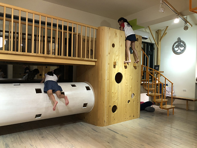 客廳. 取代一般沙發電視的居然是一整組原木遊樂器材!