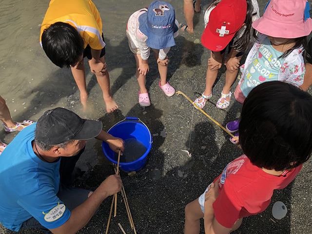 把餌埋進沙灘裡就可以等著抓螃蟹囉