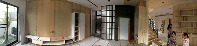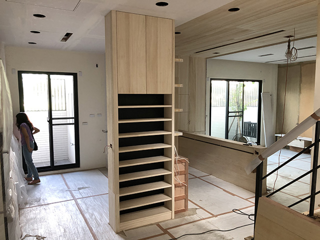 木工師傅真的很認真. 每次經過都有一些新進度: 書架長出來了