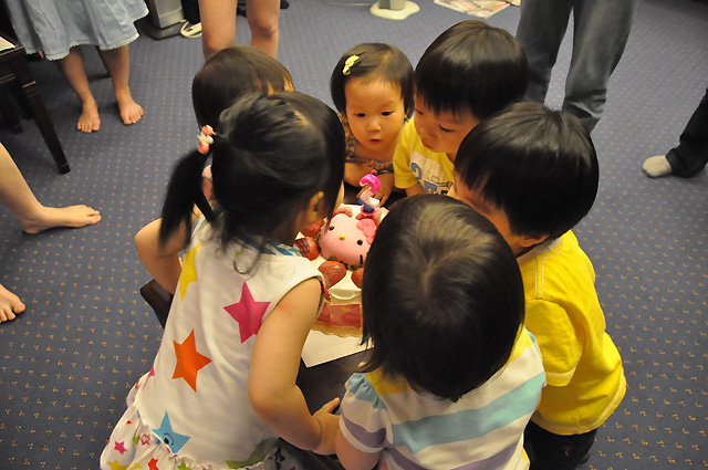Hello Kitty太吸引人了. 小鬼們圍著蛋糕不肯走