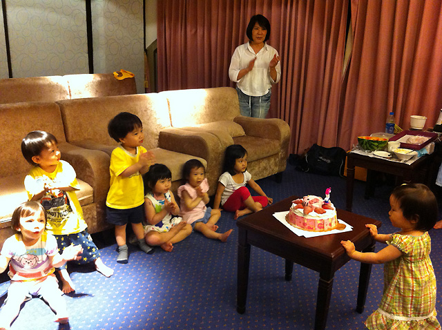 大家都很配合的唱生日快樂歌. 看來保姆平常訓練得很好…