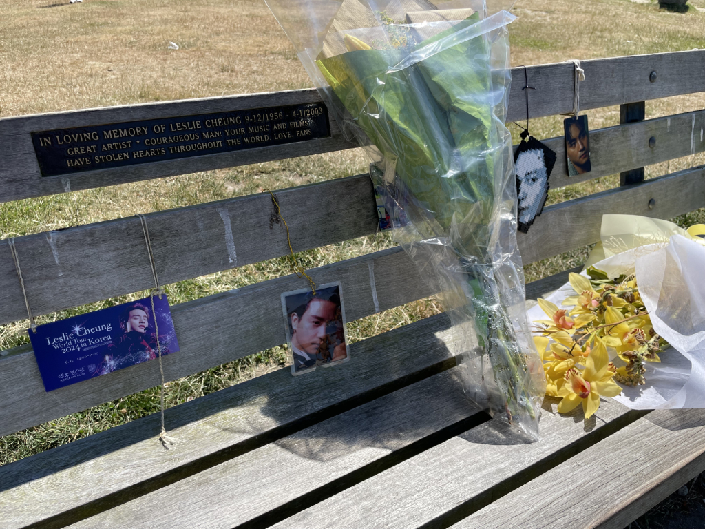 路邊長椅上幾乎都有段捐贈者銘文. 這張特別熱鬧. 滿滿鮮花照片