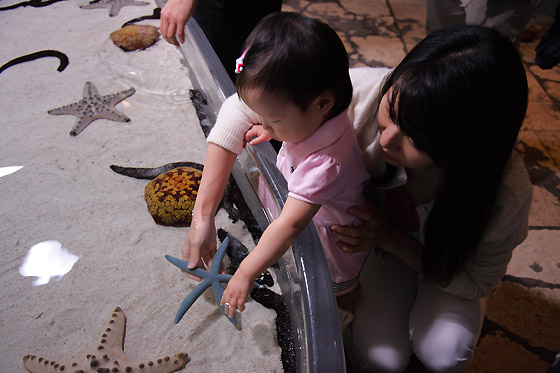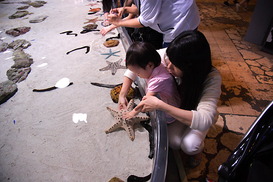 一進門就有個手感體驗池. 說服了好久. 膽小鬼妹妹才終於敢把手伸進池子摸海星