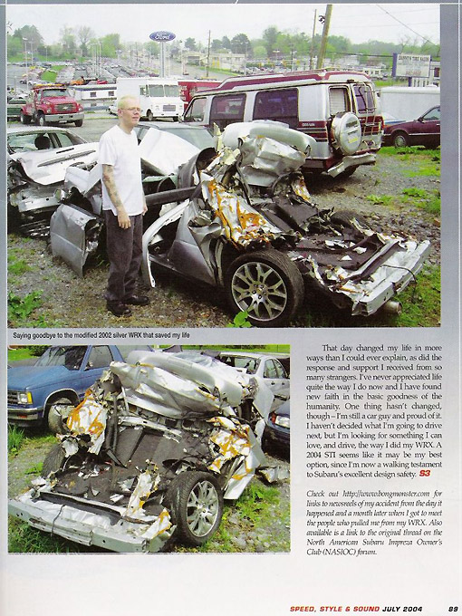 (這位老兄旁邊那堆”廢鐵”是他剛撞爛的Subaru Impreza. 看來強壯的B柱救了他一命…