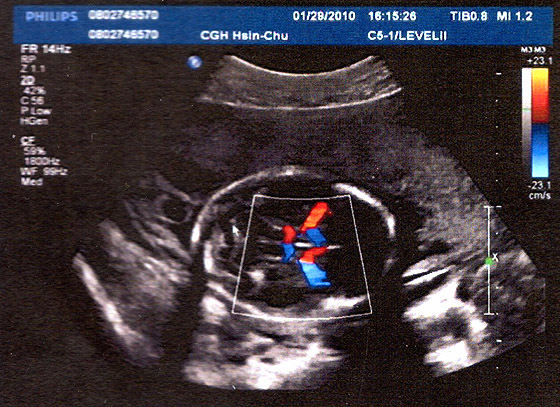 Babies. 小鬼們 高層次超音波掃描 2010-02-01 / 又是一張不知所云的超音波照片… 不過這次是彩色版啦 (有顏色的部份表示血液流動的方向) 這個. 好像是大腦 (?) 根據醫生的說法. 兩邊長得有對襯到. 很好! 另外… 五根手趾頭. 有! 五根腳趾頭. 有! 一整根脊椎. 有! 心臟一顆. 有! 腎臟兩顆. 有! 其他小鬼問題. 沒有! 排了半天. 總共掃描了半個小時的高層次超音波掃描. 結論大概就是這樣. (沒想到我也會淪落到按時更新小鬼照片的這一天啊…)