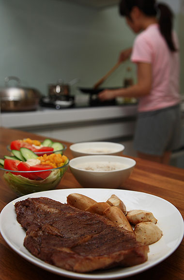 Misc. 雜七雜八 颱風天 2009-08-09 / 颱風天悶在家裡雖然無聊. 也不是沒有好處的… 賀! 夫人賞賜頂級牛排特餐耶: 有圖有真相. 真的是夫人親自下廚喔 當然. 如果有什麼牛排色澤不對. 不新鮮. 看起來不好吃… 等等問題 不是照相的人技術太差! 就是相機壞了!!