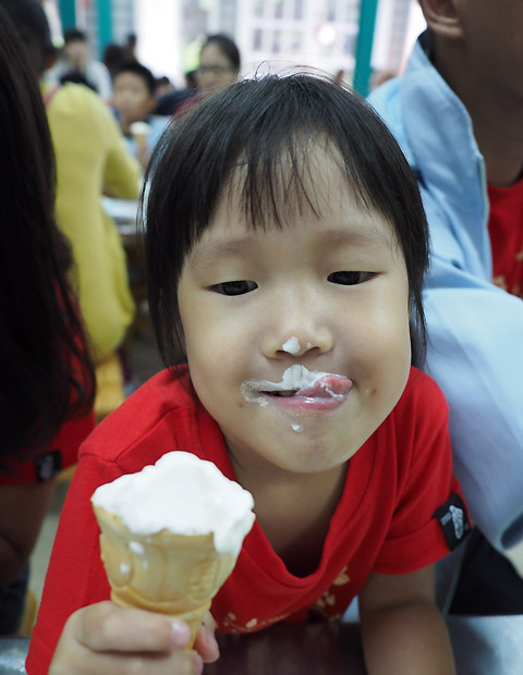 有人趁媽媽不注意在偷舔蓋子上的冰淇淋喔