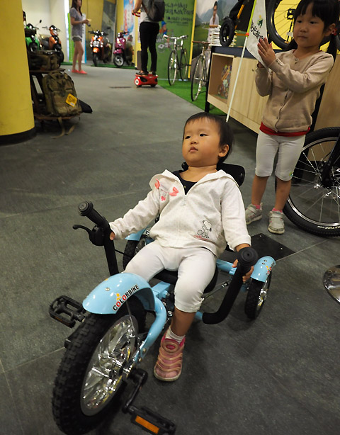 看姊姊騎的很開心. 小妹妹也吵著要玩一下