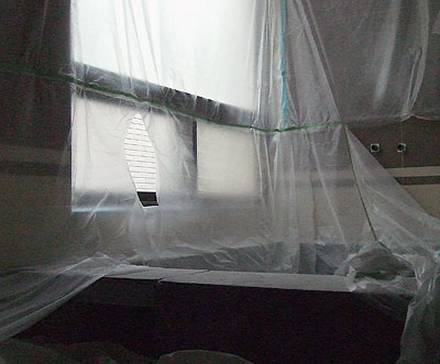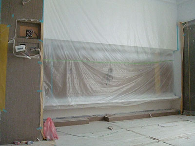 客廳. 聽說是要噴漆什麼的. 電視牆硬是被包成這樣…