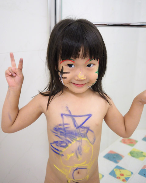 問媽媽: 這個蠟筆可以畫身上嗎? 才剛說可以. 轉頭就變這樣了…