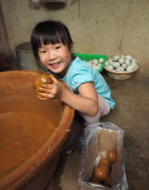 把選好的蛋放進溫泉水+紅土+粗鹽的泥漿裡
