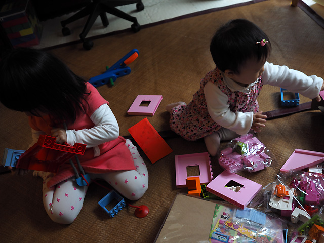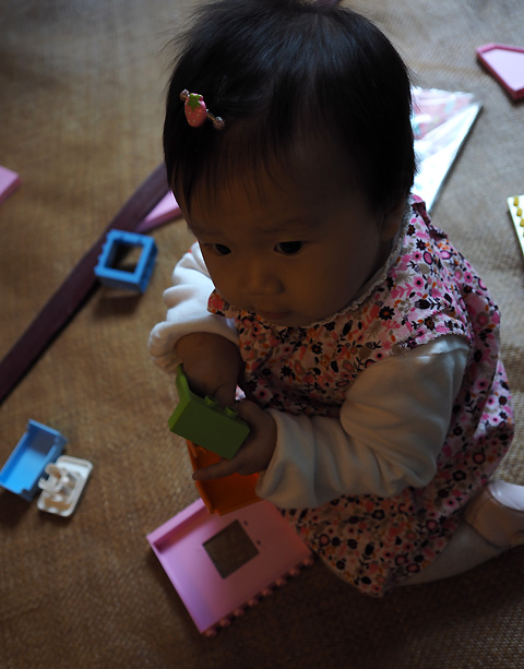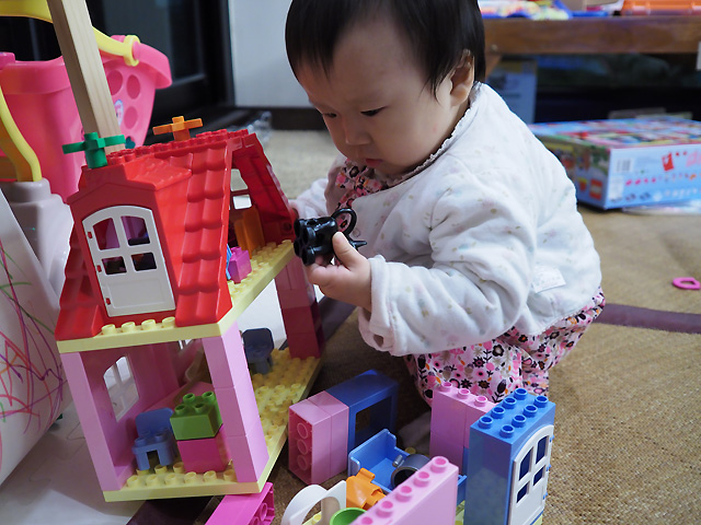 姊姊很快的蓋好一棟房子就跑去玩其他的玩具了. 丟下小妹妹研究中