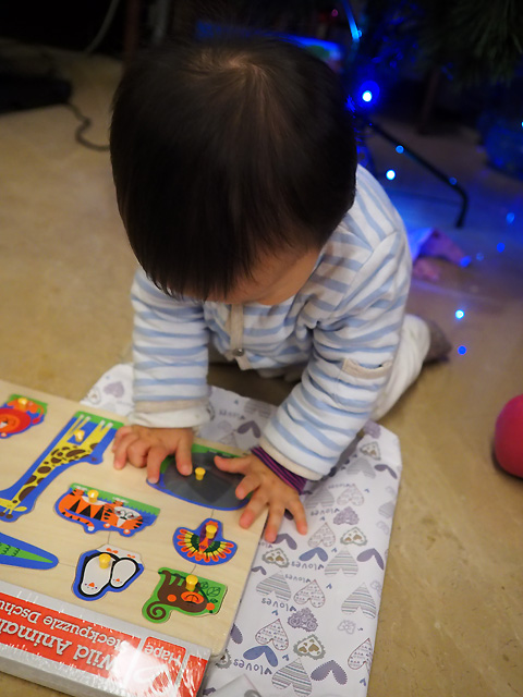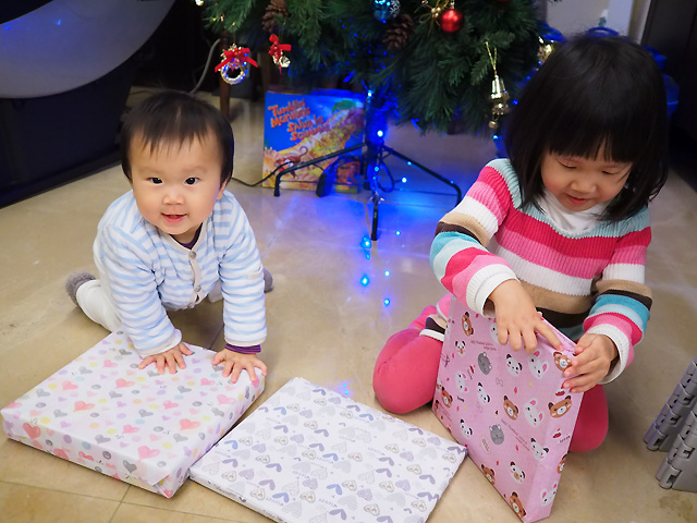 姊姊有兩個禮物. 一個是媽媽送的小掛鐘 (最近很愛問時間. 乾脆買個時鐘教妍妍自己看)