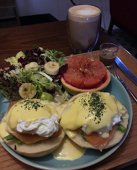 高雄. 菜鴨子. 主打手工麵包的早午餐店. 荷蘭醬鮭魚baggle整個滿出來啦